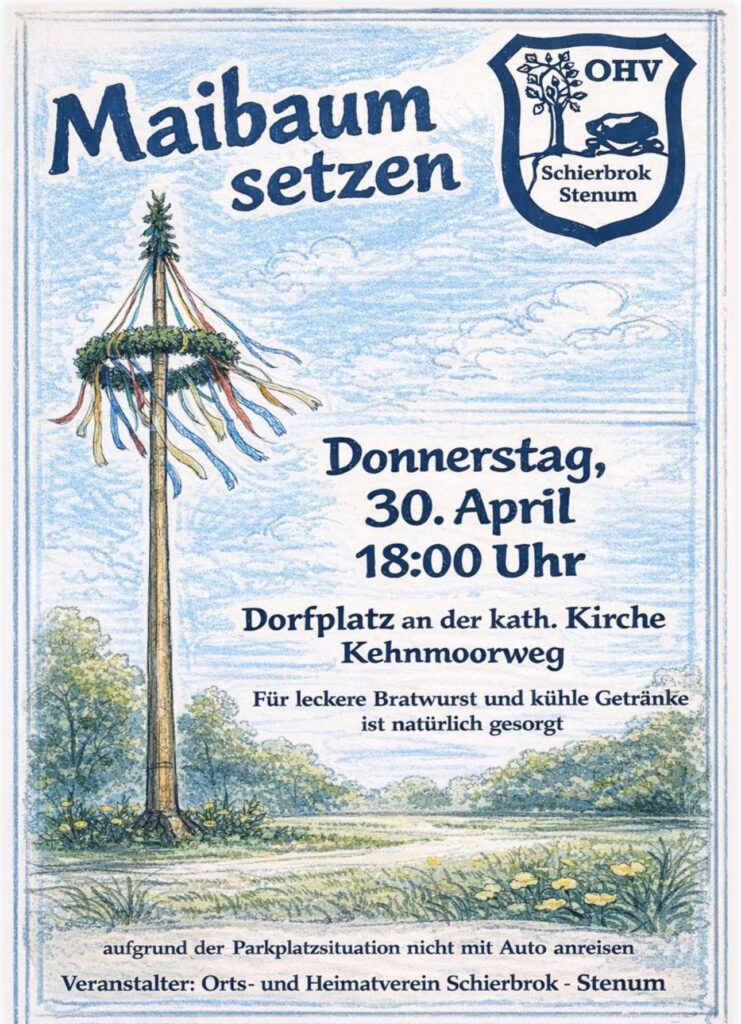 Am 30.04.2026 findet die Feier in den Mai am Dorfplatz in Schierbrok-Stenum statt. Ab 18.00 Uhr werden wir auf dem neuen Dorfplatz an der kath. Kirche am Kehnmoorweg den Maikranz aufziehen. Dazu gibt es Bratwurst vom Grill, Getränke und Klönschnack mit netten Leuten. Alle Mitglieder, Nachbarn, Freunde und Bekannte sind herzlich eingeladen.